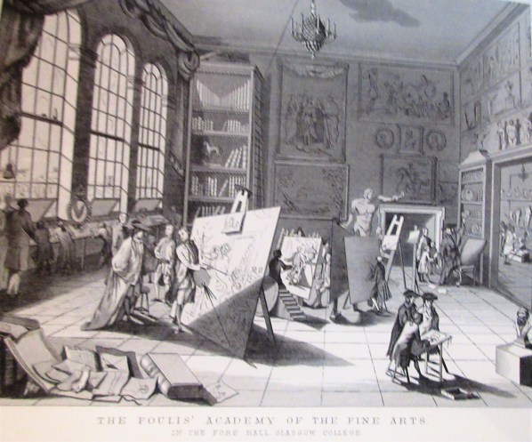 He, Adam Ingram and John Coates Campbell also supported financially the Foulis Art Academy founded in 1753/54 by Robert and Andrew Foulis, the University’s printers. Students were taught painting, drawing, engraving and modelling and were accommodated in rooms freely given by the University with exhibitions of their work being occasionally held in the faculty hall.[3]