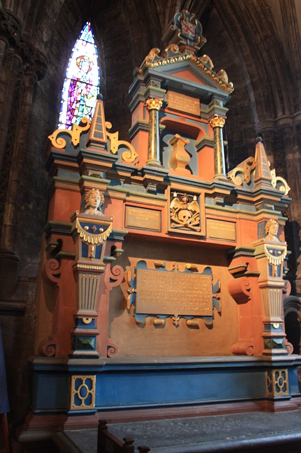 On his death his wife had erected in the chancel of the cathedral a magnificent monument, described as the finest in the ‘High Kirk’ commemorating his life and his gifts to Glasgow..[14]