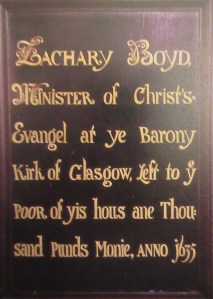 According to most biographical notes on Zachary or Zacharias Boyd he was born around 1585 in Ayrshire, a descendent of the Boyd family of Pinkhill and Trochrig. He was educated at Kilmarnock School and matriculated at Glasgow University in 1601.He gained an MA from St Andrews University in 1607 and then went to the protestant college at Saumer in France (where his cousin Robert Boyd had a professorship) subsequently becoming Regent Professor there in 1611. He eventually returned to Scotland and in 1623 was appointed minister of Barony Parish Church in which position he remained for the rest of his life.[iii]